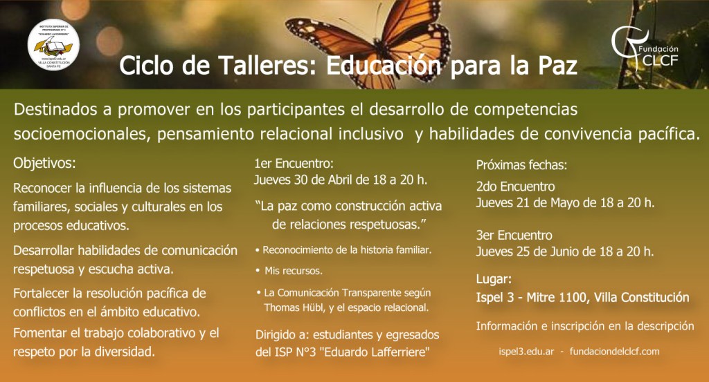 El ISP N° 3, la Fundación CLCF y la Coordinación de Formación Permanente, invitan al «Ciclo de Encuentros de Educación para la Paz»